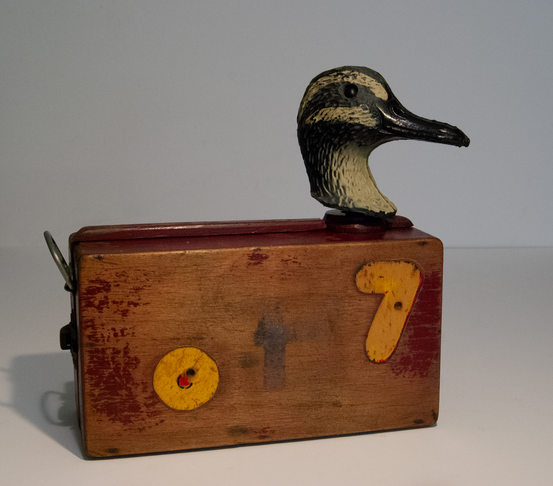 Materials: vintage wooden decoy duck heads, vintage wooden utility box, painted timber inlay, timber, handmade mechanical parts, and music box movement.