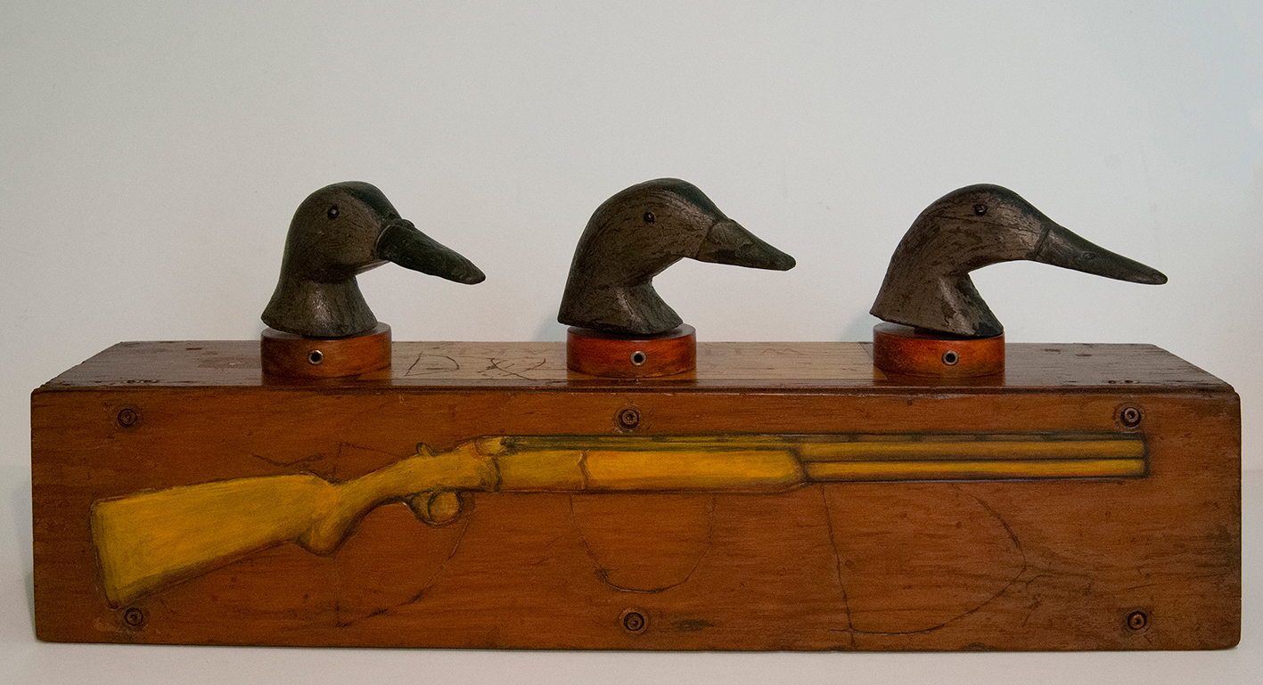 Reminiscent of fairground games such as the Laughing Clowns and Shooting Gallery, this work was made in response to the thousands of ducks that are shot for sport every year during duck hunting season in Australia. On winding the key on the side of the work, the decoy duck heads turn from side to side in unison.